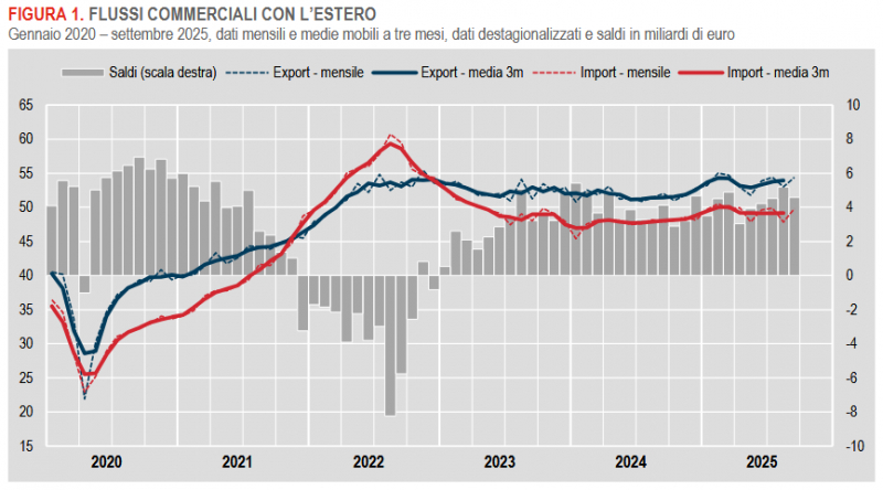 A settembre 2025 l’export cresce su base annua del 10,5% in termini monetari e del 7,9% in volume. La crescita tendenziale dell’export riguarda entrambe le aree, Ue (+10,2%) ed extra Ue (+10,9%). L’import registra un incremento tendenziale del 9,9% in valore, che coinvolge in misura più marcata i mercati extra Ue (+13,7%) rispetto a quelli Ue (+7,2%); in volume, le importazioni crescono dell’11,9%.